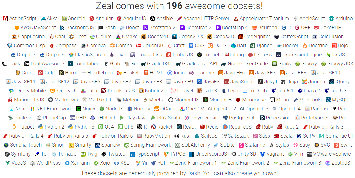 - Dash 中的文档都可以在 Zeal 中使用