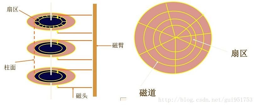 盘面被划分为有限个同心圆,这些同心圆就是磁道,所有盘面中相同半径的磁道组成一个柱面(类似圆柱体),同一个磁道会被划分为多段圆弧,这一段段圆弧称为扇区,扇区大小为512B,扇区为磁盘最小的物理存储单元。